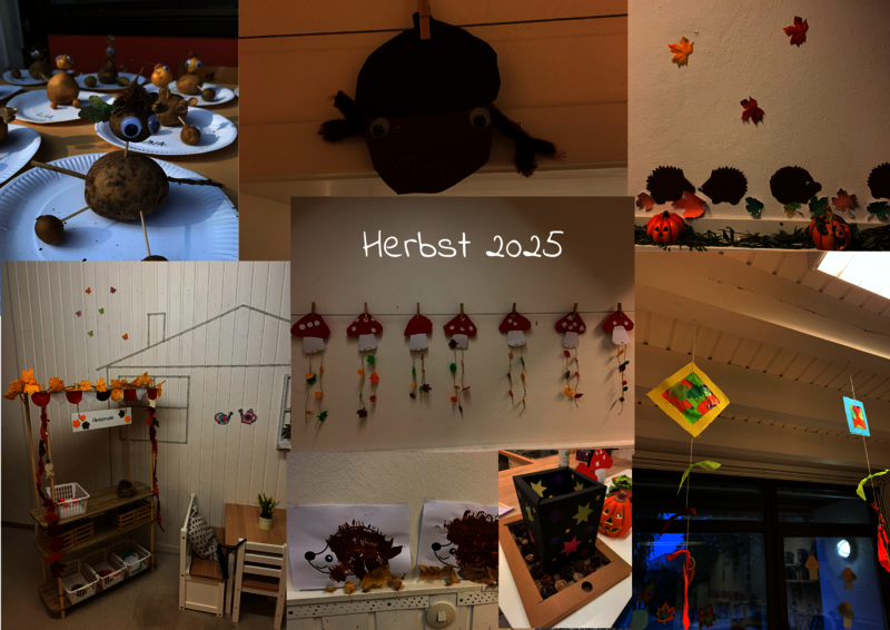 Im Herbst begannen die Löwenzähne damit, aus der Puppenecke einen Herbstmarkt zu machen. Ein Herbstmarktstand wurde gestaltet und dekoriert. Die Kinder bastelten Dinge, die dort verkauft werden konnten. Zum Herbst gehörten natürlich auch bunte Blätter, Herbstlieder, Pilze, Drachen, Laternen, Eicheln und Igel.